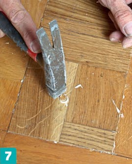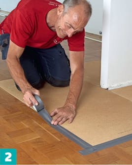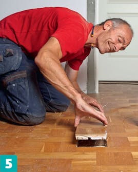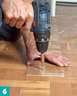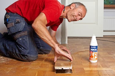 Sivele laudan reunoihin liimaa ja paina lauta reikään. Upota laudan pinta samaan tasoon muun lattian kanssa.