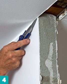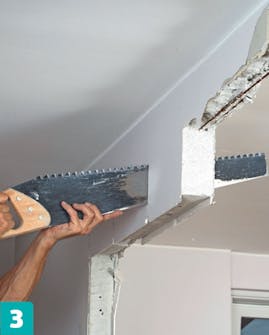 Kattoon väliseinän kohdalle jäänyt reikä pitää paikata kipsilevyllä, ja reikä on tasoitettava piiloon.