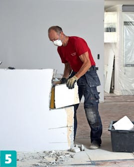 Pura ensimmäiseksi oven päällä oleva seinänpätkä, jotta se ei putoa lattialle. Pura levyt kokonaisina tai sahaa seinä helposti käsiteltäviksi paloiksi.