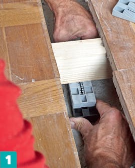 Aseta paikkauslaudan alle uudet tukipuut 40 sentin välein, ja kiilaa ne lujasti lattian ala pintaa vasten. Ruuvaa kiilat kiinni toisiinsa ja lattiaan. Sivele liimaa tukipuiden ja lattian väliin.
