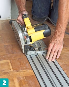 Sahaa reiän reunat suoriksi joko upotus- tai pistosahalla. Käytä apuna ohjainkiskoa tai suoraa lautaa. Käännä terä noin 10 asetta vinoon siten, että reikä on levein lattian pinnassa.