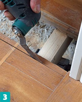 Sahaa seinien vierustat suoriksi multicutterilla. Sahaa reikä vinoon samalla tavalla kuin lattian keskellä.