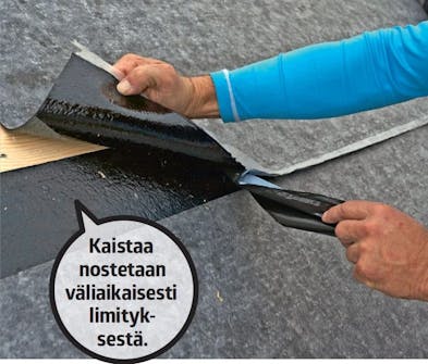 Seuraava kaista limitetään ensimmäisen päälle. Valmistajat laittavat bitumimassan valmiiksi limityksiin.