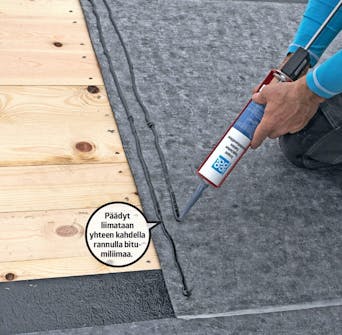Kaistat pitää kiinnittää toisiinsa myös päistä. Se tehdään liimaamalla. Levitä silikoni pistoolilla kaksi rantua bitumimassaa.