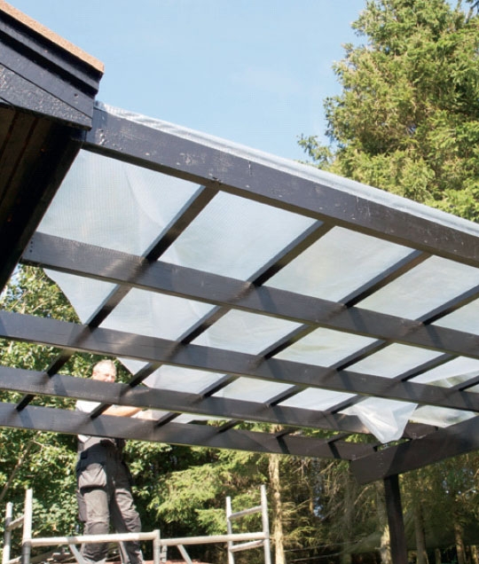 Ennen kuin Fastlock Uni -katoksen pienet levyt työn-netään kiinnikkeisiin, levy-jen välit suljetaan vaahtomuovi-profiileilla ylä- ja ala-reunasta.