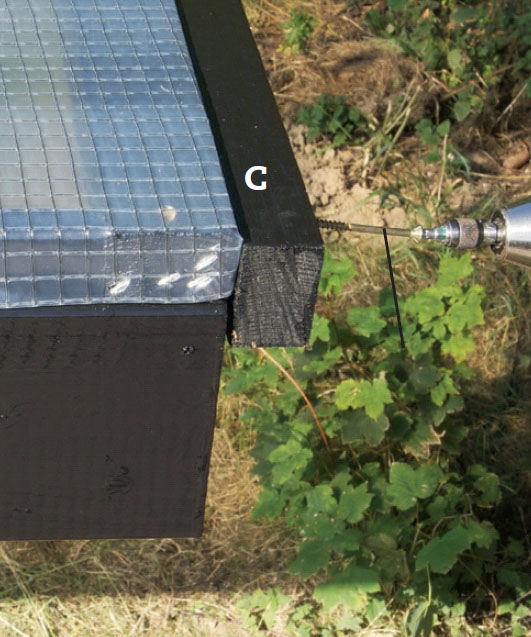 Ruuvaa katoksen alareunaan kiinnirima (C) alimman riman ulkopuolelle, jot-ta kate puristuu kiinni. Pelkät sin-kilät repeytyvät nopeasti mate-riaalin läpi. Vaihtoehtoisesti voit ruuvata laudan katteen päälle.