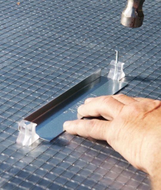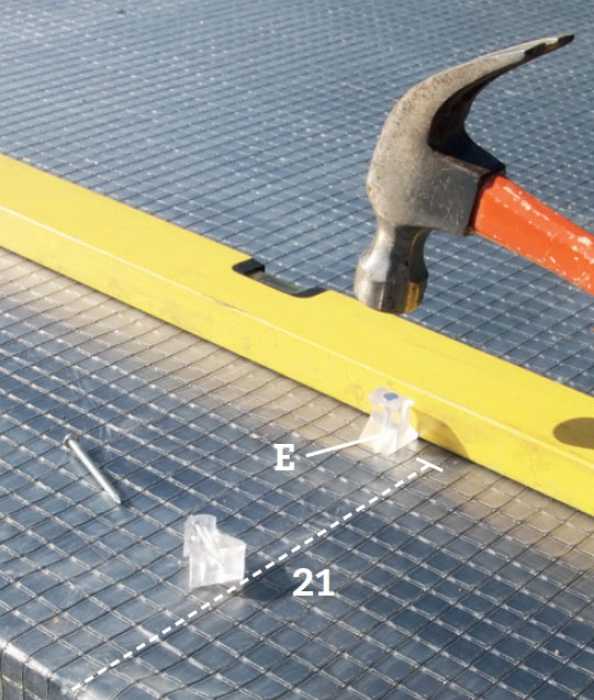 Naulaa rimoihin kiinnikkeet (E). Niillä kiinnite-tään katon päällimmäinen levy-kerros. Ensimmäinen rivi asennetaan kaikkien rimojen keskelle 21 cm:n päähän reunasta. Kiinnikerivin pitää olla suora.