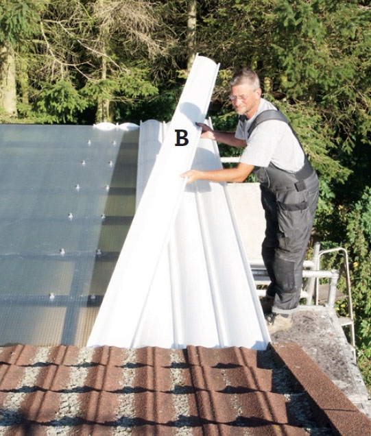 Kapeat kattolevyt (B) asennetaan yksi kerrallaan. Pieni sauma kiinnittyy kiinnikkeillä ja isompi edellisen levyn pieneen saumaan.