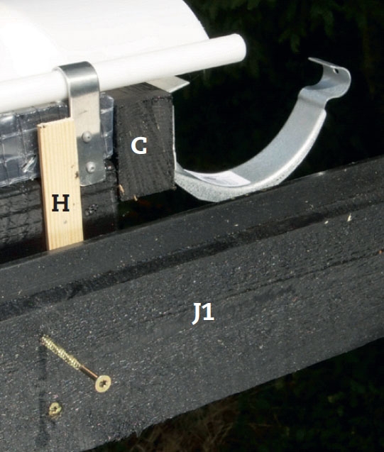 Sivureunat katetaan kahdella tuulilaudalla Ne työnnetään hieman palkeista irti rimoilla (H). Me käytämme irtopalikkaa, joka naulataan palkkiin. Alin tuulilauta (J1) kiinnite-tään ensin, sitten ylempi (J2).