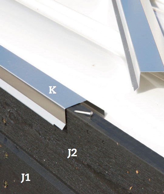 Tuulilautojen yläpinnat suojataan alumiinilistalla (K), joka ohjaa veden pois puurakenteista. Metrin pituiset peitelistat työnnetään toistensa päälle limittäin ja kiinnitetään alumiininauloilla.