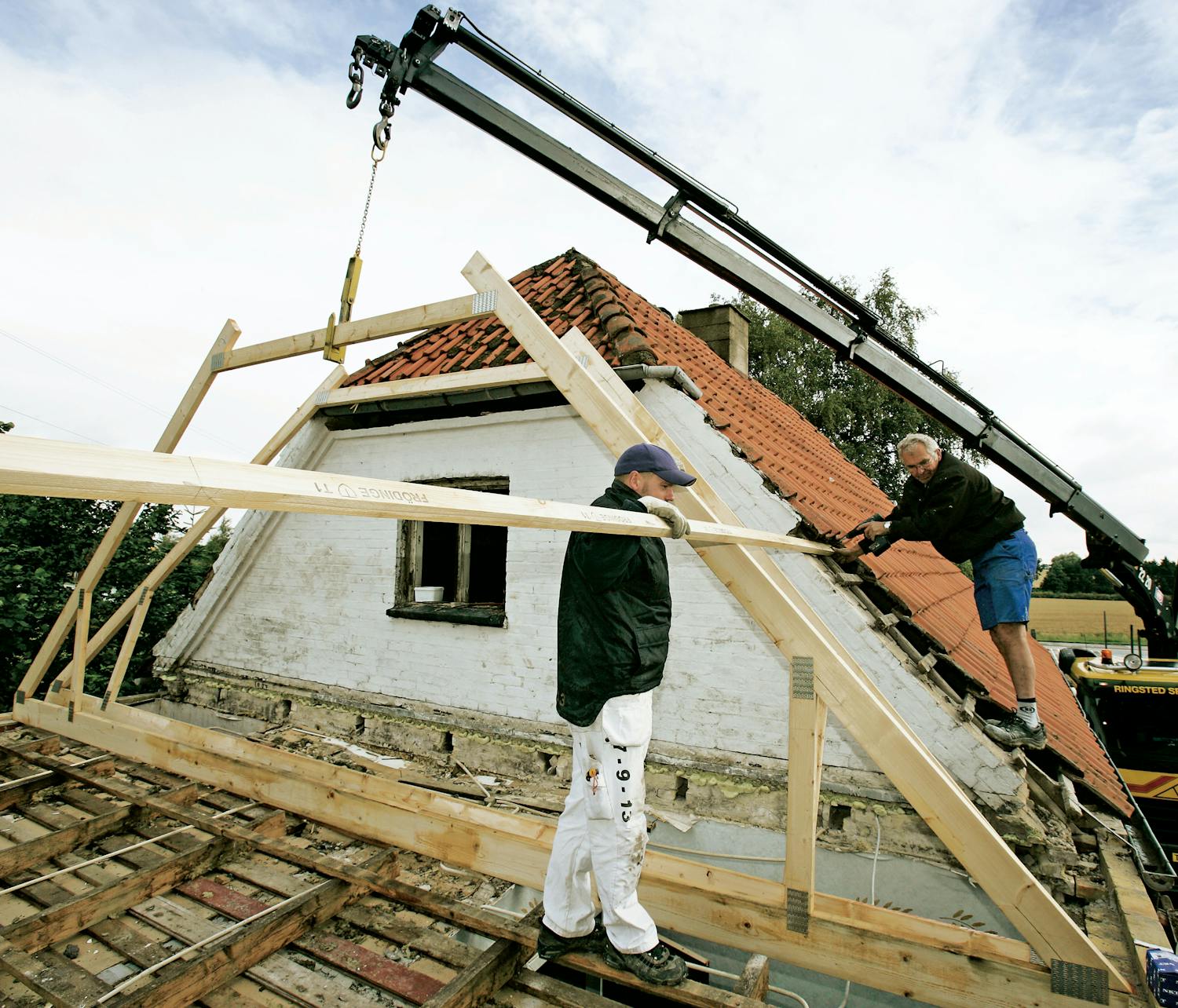 Heikki, hänen poikansa Martti ja vävy-poika Petteri ovat kaikki työn touhussa kattotuolien saapuessa. Valmistaja on lastannut tavarat suurimpaan kuorma-autoonsa, joka ei mahdukaan tulemaan talon pihaan. Onneksi autossa on korkea nosturi ja kuljettaja sattuu olemaan Hei-kin tuttu, joten hän auttaa mielellään lastaamaan kattotuolit pihaan.