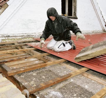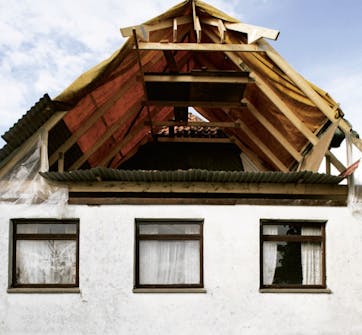 Lisärakennuksen katto puretaan valmiiksi uusia kattotuoleja varten. Työ jouduttiin aloittamaan sadepäivänä. Rakennus suojataan yöksi levyillä odottamaan uusien tuolien saapumista.