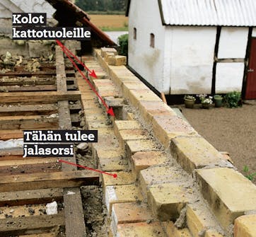Lisärakennuksen katon ala-reunaan tulee viisi tiilikerrosta, jotka muurataan linjalangan avulla päärakennuksen seinän kanssa linjaan. Reunan on oltava vaaterissa, koska uudet kattotuolit lepäävät muurin varassa.