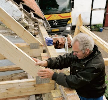 Heikki tarkistaa, että kattotuolit sopivat muurin aukkoihin ja että ne ovat täsmälleen 100 sentin päässä toisistaan. Kattotuolien väleihin tulee palkit metrin välein, jolloin toisen kerroksen lattiassa on tuki aina 0,5 m:n välein.