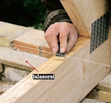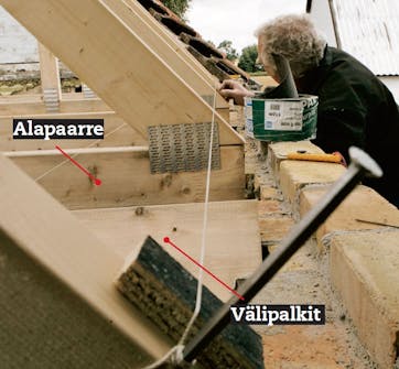 Kattotuolit oikaistaan paikoilleen linjalangan avulla. Orsi on luonnollisesti vaaterissa, onhan Heikki muurannut sen.