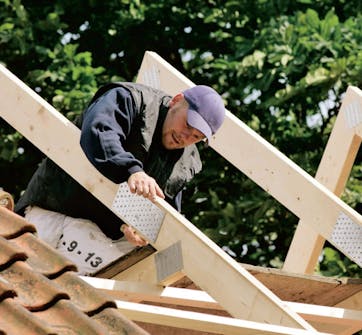 Kattotuolien ylä- ja alaosat ovat kul-jetuksen aikana erillään, jolloin niitä on paljon helpompaa käsitellä. Ensin asete-taan alaosat paikalleen lisäsiiven päälle ja lopuksi kiinnitetään yläosat naulaus-levyillä. Tässä vaiheessa rakennusurak-ka alkaa jo muistuttaa kattoa.
