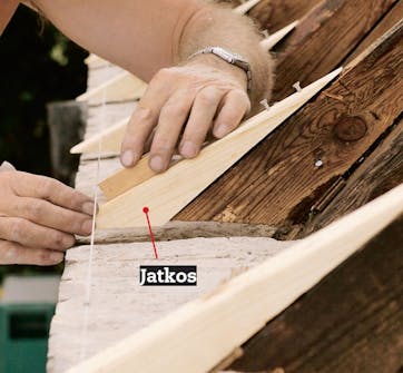 Heikki asentaa kaikkiin alapaarteisiin jatkokset, jotta alimmat kattotiilet asettuvat oikein. Jatkokset sovitetaan yksitellen sekä uusiin että vanhoihin alapaarteisiin.