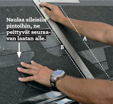 Asenna ensimmäiset bitumikattolaatat. Räystäslevy on nyt asennettu toisen liitunaruviivan (A) mukaan, joten nyt bitumilaatat asennetaan toisen merkkiviivan (B) mukaan. Alareunan pitää myötäillä räystäspeltiä.