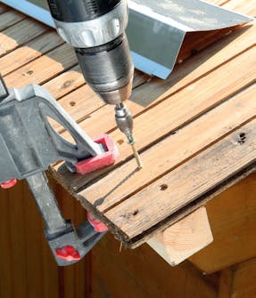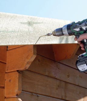 Kiristämme lautojen alle 45 x 45 mm:n riman, jotta kattolautojen päät voidaan sahata siistiksi. Kiinnitä rima 4 x 40 mm:n ruuveilla.