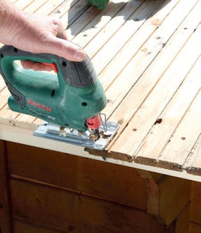 Sahaamme 5 mm:n etäisyydeltä rimasta eli poistamme noin 25 mm lautojen päistä. Käytä pisto- tai pyörösahaa.