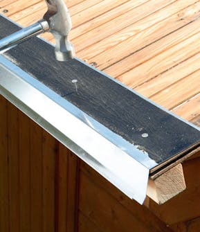 Naulaa suojapelti tuulilaudan yläreunan päälle. Aloita alhaalta ja kiin nitä muovipinnoitettu suojapelti rih latuilla nauloilla.