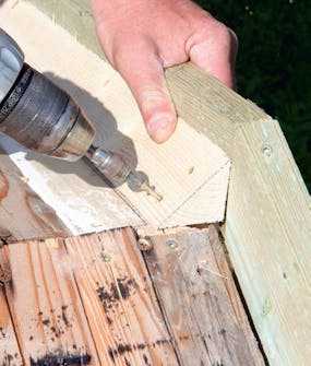 Vanhat tuulilaudat poistetaan. Ohuet laudat vaihdetaan 25 x 150 mm:n painekyllästettyihin lautoihin. Lautojen ylälinjan tulee yltää 7 cm kattolaudoituksen yli. Käytä 5 x 80 mm:n ruuveja.