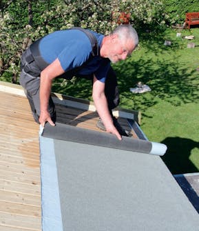 Rullaa ensimmäinen kattohuopavuota katolle niin, että vuodan alareuna tulee 5-10 mm räystäsreunan ylä-puo lelle. Vuodan pituuden on vastattava sivujen kolmio-listojen välistä etäisyyttä.