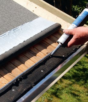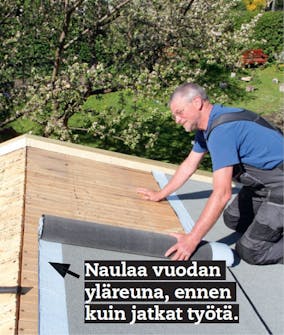 Lisävarmistus. Katon mo -lemmat sivut varmis tetaan ylimääräisellä täysliimat ta valla bitumihuopa kais taleel la. Vedä suojamuovi puoliksi pois. Pi dä peh meää reunaa tuulilau dan ylä-reunaa vasten ja naulaa kaistale.