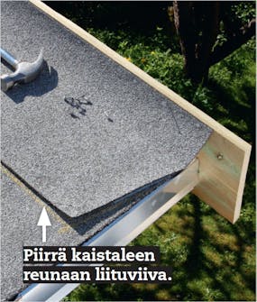 Uudet muovipinnoitetut räystäspellit asennetaan lyhennettyyn räystäslinjaan. Peltejä lyhennetään peltisaksilla niin, että ne limittyvät pari senttimetriä. Kiinnitä nauloilla.