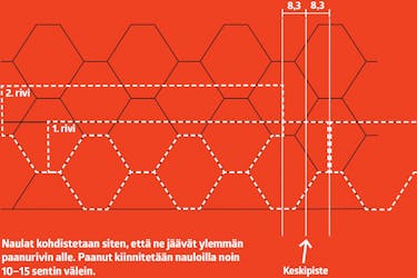 Lado paanut kahden apuviivan mukaan, jotta katolle muodostuu siisti kuvio. Kohdista joka toisen rivin paanut samaan merkkiin. Paanut kiinnitetään kumibitumiliimalla ja nauloilla ja leikataan poikki otsalauto-jen mukaan.