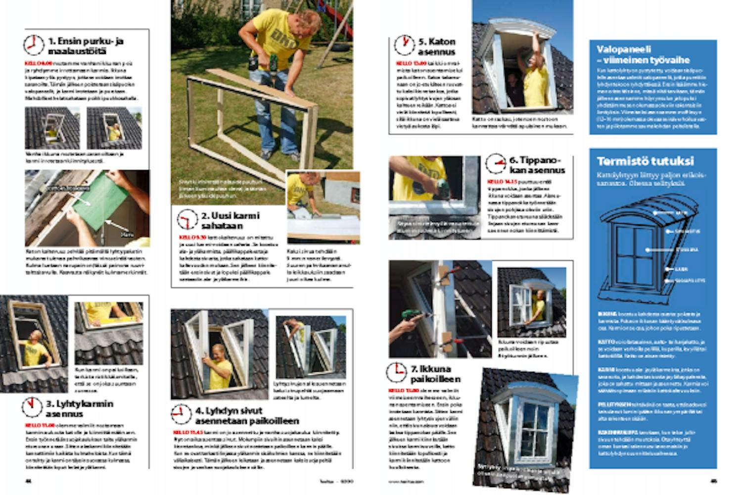 Ensin purku- ja maalaustöitä Ikkuna kipataan ylös pystyyn, jotta se voidaan irrottaa saranoilta. Tämän jälkeen poistetaan sisäpuolen valopaneelit, ja karmi irrotetaan ja puretaan. Mahdolliset helat sahataan poikki puukkosahalla.