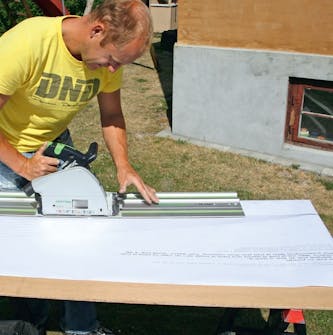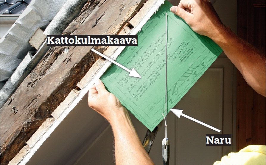Katon kaltevuus selviää pitämällä lyhtypaketin mukana tulevaa pahvikaavaa vinoseinää vasten. Kulma luetaan narupainon (tässä painona ruuvi-taltta) avulla. Kaavasta näkyvät kulmamerkinnät.