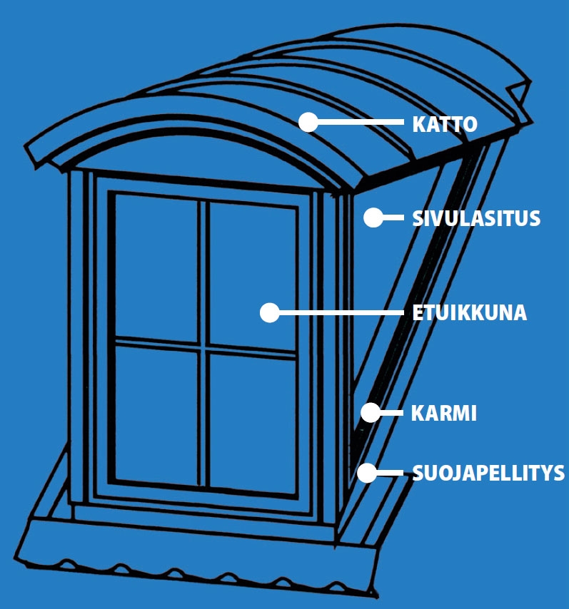 Ikkuna paikoilleen Ensin poka irrotetaan karmista. Sitten karmi asennetaan lyhtysivujen väliin niin, että sivun alaura voidaan laskea tippanokan päälle. Sen jälkeen karmi kiinnitetään sivuissa karmiruuveilla, katto kiinnitetään lopullisesti ja karmi kiinnitetään kattoon huulloksesta.