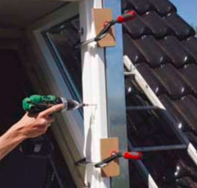 Katon asennus Katon takareu-naan on jo etukäteen ruuvat-tu kaksi kierretankoa, jotka sopivat lyhtysivujen yläosan kahteen reikään. Kattoa ei vielä kiinnitetä lopullisesti, sillä ikkuna on vielä saatava vietyä aukosta läpi.