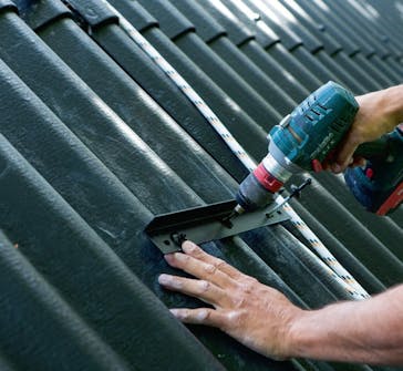 Jatka 3. ja 4. levyllä. Ennen kuin mikään levy kiinnitetään, alemman apurin on tarkistettava suunta: hän asettuu telineille ja tarkistaa poimujen suoruudun riveittäin. Jos jokin ei levy ole täysin suorassa, irrota pari ruuvia ja työnnä levy paikalleen.