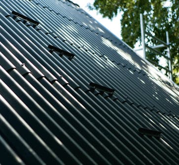 Tarkista jatkuvasti, että kattolevyt asettuvat siististi: asetu telineille tarkis-tamaan, että poimut ja rivit ovat linjassa ja ota tarkistusmitat katonreunasta kol-meen eri korkeuskohtaan.