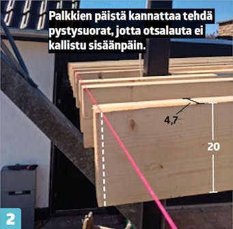 Viritä linjalanka palkkien yli ja merkitse kääntökulman avulla, mistä kohdasta palkit pitää sahata poikki. Voit käyttää pistosahaa, käsisahaa tai käsisirkkeliä.