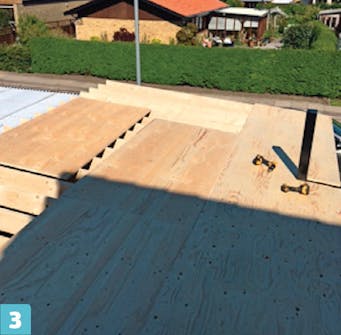 Levitä kattolevyt palkkien päälle. Tässä Tässä käytetään 22 millin pontattua katevaneria, jotta rakenteesta tulee mahdollisimman tiivis ja tukeva.