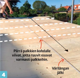 Piirrä värilangalla 5-6 suoraa linjaa lappeen suunnassa. Tee sen jälkeen viivat palkkien kohdalle. Ruuvaa katelevyt kiinni palkkeihin 5x100 millin puuruuveilla.
