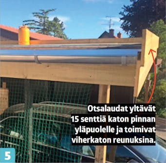 Asenna räystäspellit, otsalaudat, kouru kouru-koukut ja räystäskourut. Tässä viherkatossa kasvaa melko pitkiä kasveja, jotka tarvitsevat paljon multaa, joten otsalaudat nousevat noin 15 senttiä katon yläpuolelle.