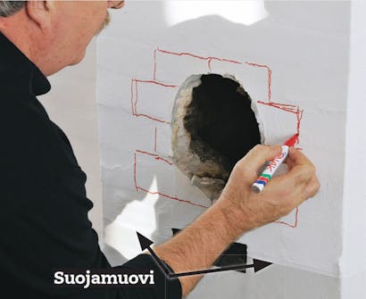 Aseta reiän pohjalle paksu kerros laastia pienellä muurauskauhalla. Sekoita laastiin vettä pakkauksen ohjeen mukaan. Levitä laasti niin, että aukon ulkoreuna viistää sisäänpäin.