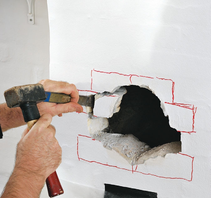 Poista rappaus saumojen päältä. Käytä kapeaa talttaa ja pitele sitä viistosti, kun talttaat aukon suuntaan. Iske tiilet irti ja poista saumat kokonaan, jotta saat uudelle laastille tilaa.