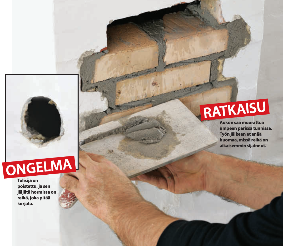 Puhdista reikä huolellisesti harjalla ja pölynimurilla, kun olet poistanut kaikki tiilet ja vanhan laastin. Kostuta reikäkohdan tiilet runsaalla vedellä, jotta vesi ei imeydy korjaus-laastista liian nopeasti.