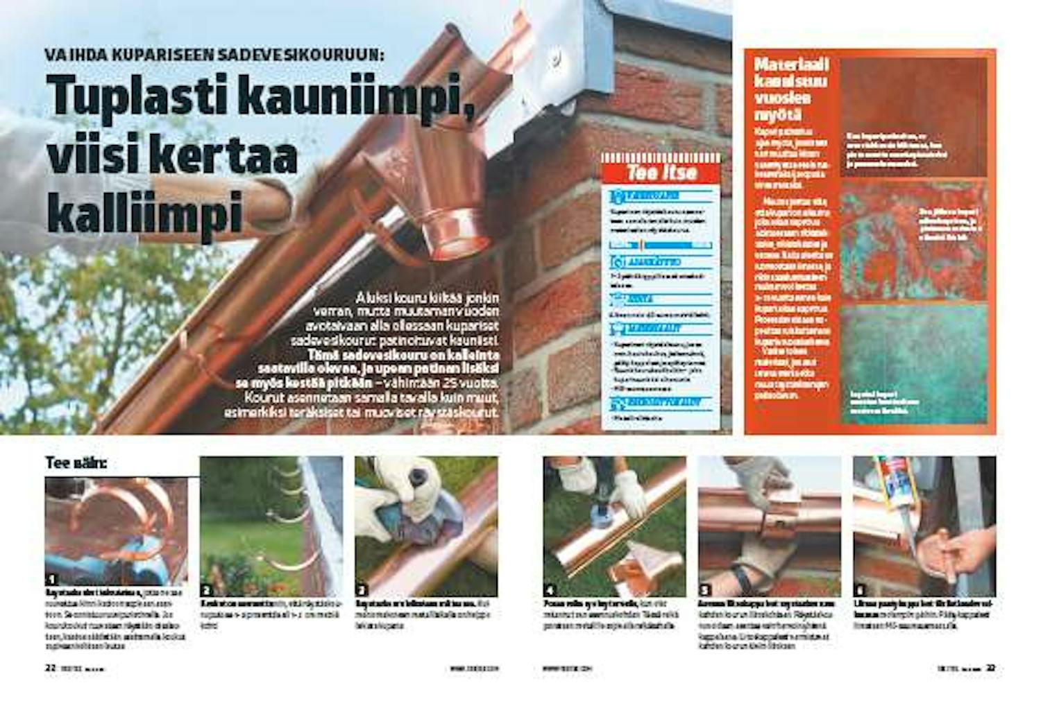 - Kuparinen räystäskouru, jossa mm. kourukoukut, jatkomuhvit, päätykappaleet ja syöksytorvet.