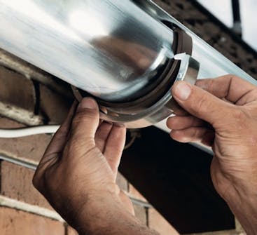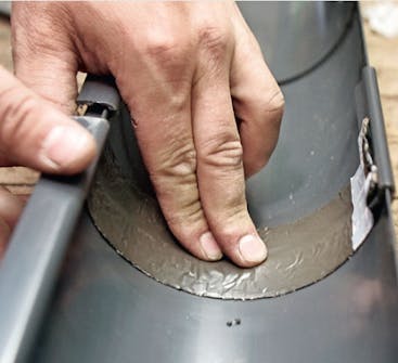 Kaulus liimataan kou-ruun erikoissilikonilla. Useimpien nykyaikais-ten kourujärjestelmien kaulukset lukittuvat kiinni kouruun. Puhdista kourun pinta huolelli-sesti rasvasta ennen kauluksen asentamista.