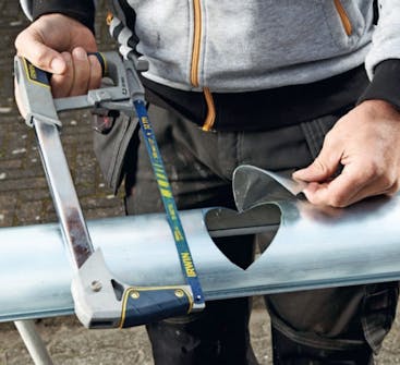 Reikä tehdään kou-ruun rautasahalla. Piirrä kourun reunoille ja pohjaan merkit 4,5 senttiä kourun keskeltä. Sahaa pisteiden välille jäävä osa pois rautasahalla.