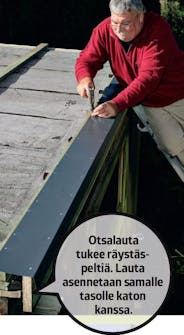 Kiinnitä ylimmät otsalaudat ennen reuna peltien asentamista. Otsalaudan yläreuna kohdistetaan ruoteen pinnan tai poimun harjan tasolle pellin tyypistä riippuen. Tälle räystäälle asennettiin päällekkäin kolme otsalautaa.