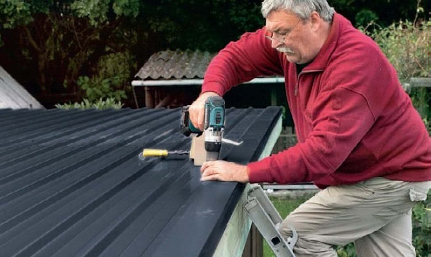 Asenna ensimmäinen pelti tarkasti suoraan kulmaan sivuräystääseen nähden. Laske katon leveys ja halkaise ensimmäinen pelti tarvittaessa, jotta toiseen reunaan ei tule liian kapeaa suikaletta. Kiinnitä ensimmäinen levy, kun se on tarkasti oikealla paikalla.