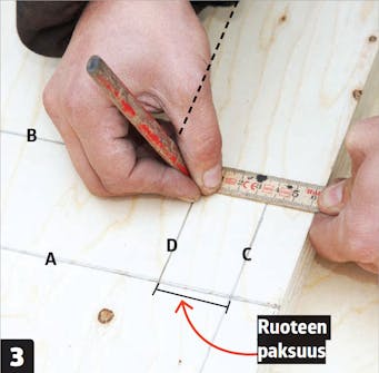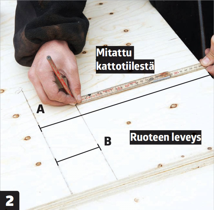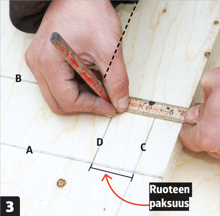 Merkitse mitta levyn reunaan ja vedä siihen kohtisuora viiva (A). Piirrä sen jälkeen levylle samansuuntainen viiva (B). Jätä viivojen väliin ruoteen leveyden verran tilaa.