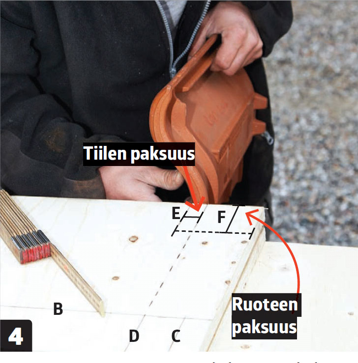 Merkitse tiilen paksuus (E) viivan (D) päähän. Piirrä myös ruoteen (F) paksuus nurkkaan. Ruode halkaistaan viistossa kulmassa.